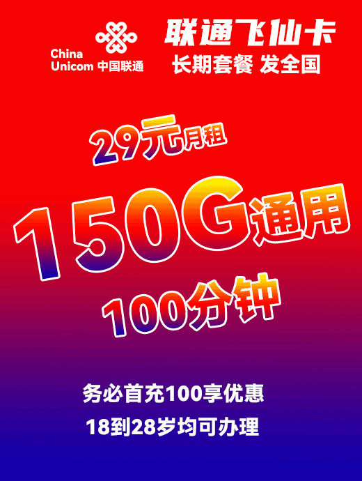 联通飞仙卡29元月享150G通用+100分钟【长期套餐 发全国】