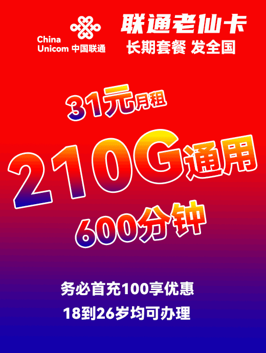 联通老仙卡31元月享210G通用+600分钟+会员N选1【长期套餐 发全国】