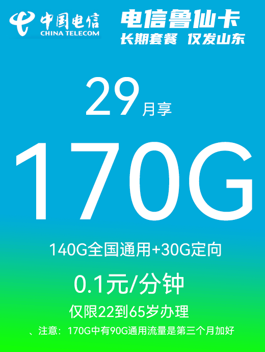 【仅发山东省】电信鲁仙卡29元月170G+0.1元/分钟【长期套餐】(其中有90G通用流量在激活后第3个月加)