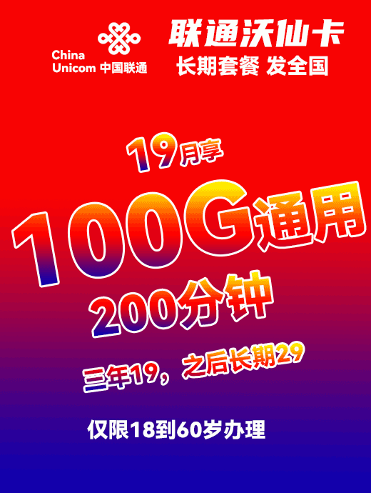 联通沃仙卡19元月享100G全国通用流量+200分钟【三年19,之后长期29】【仅限18到60岁办理】