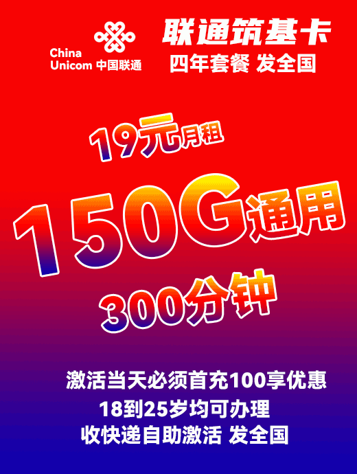 【免费领取 自助激活】联通筑基卡19元月享150G+300分钟【二年套餐 到期可续】【18到25岁均可办理】