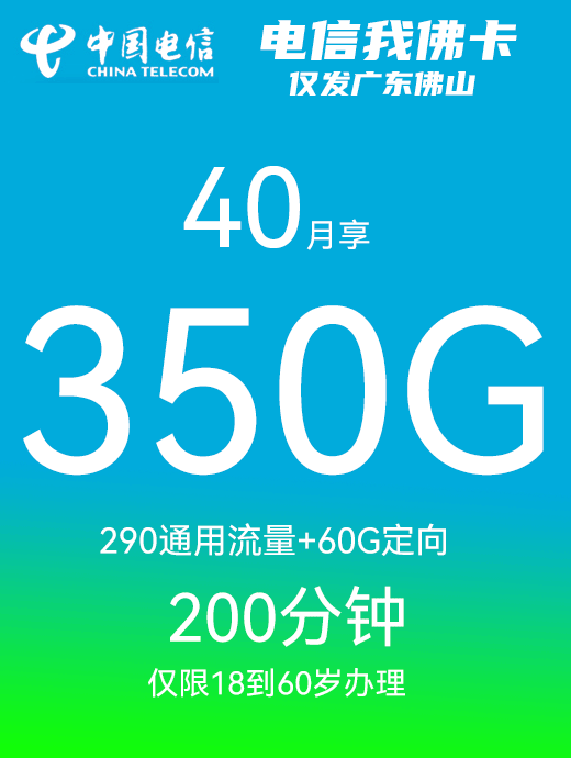 佛山电信我佛卡40元月享350G+100分钟+支持副卡(只发广东佛山)