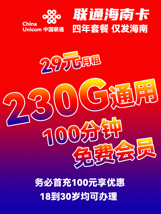 联通海南卡29月享230G通用流量+100分钟+会员任选一(4年套餐)