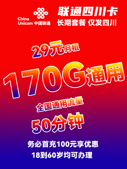 联通四川卡29元170G通用流量+50分钟通话【只发四川省内】【18到60岁均可办理】