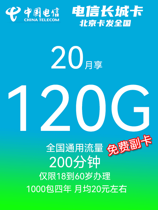 【0元预约 收费办理】北京电信长城卡20元月享120G全国通用+200分钟+免费副卡【1000包四年,月均20左右】