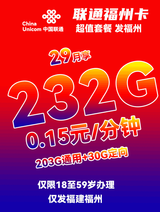 联通福州卡29元月享232G+0.15元/分钟【仅发福建福州】【202G通用+30G定向】