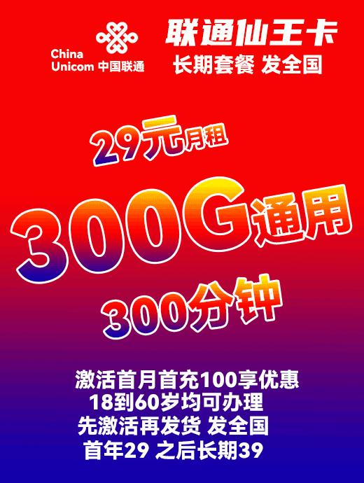 联通仙王卡29元月享300G通用+300分钟【全国发货】【首年29 长期39】