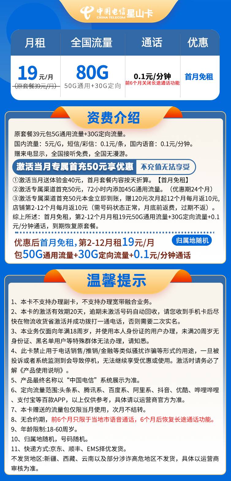电信星山卡19元月享80G流量+0.1元/分钟通话【发全国 可发北京】