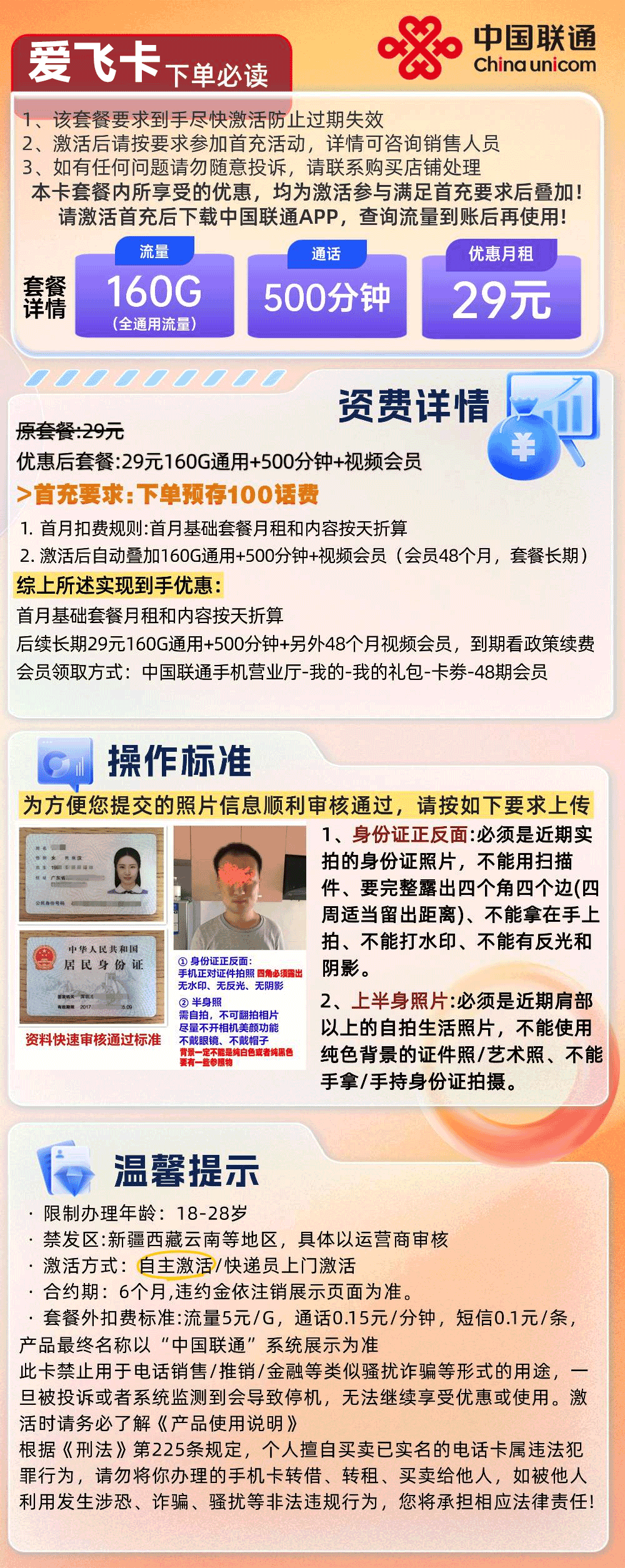 联通爱飞卡29元月享160G通用+500分钟+会员【长期套餐】【四年会员】