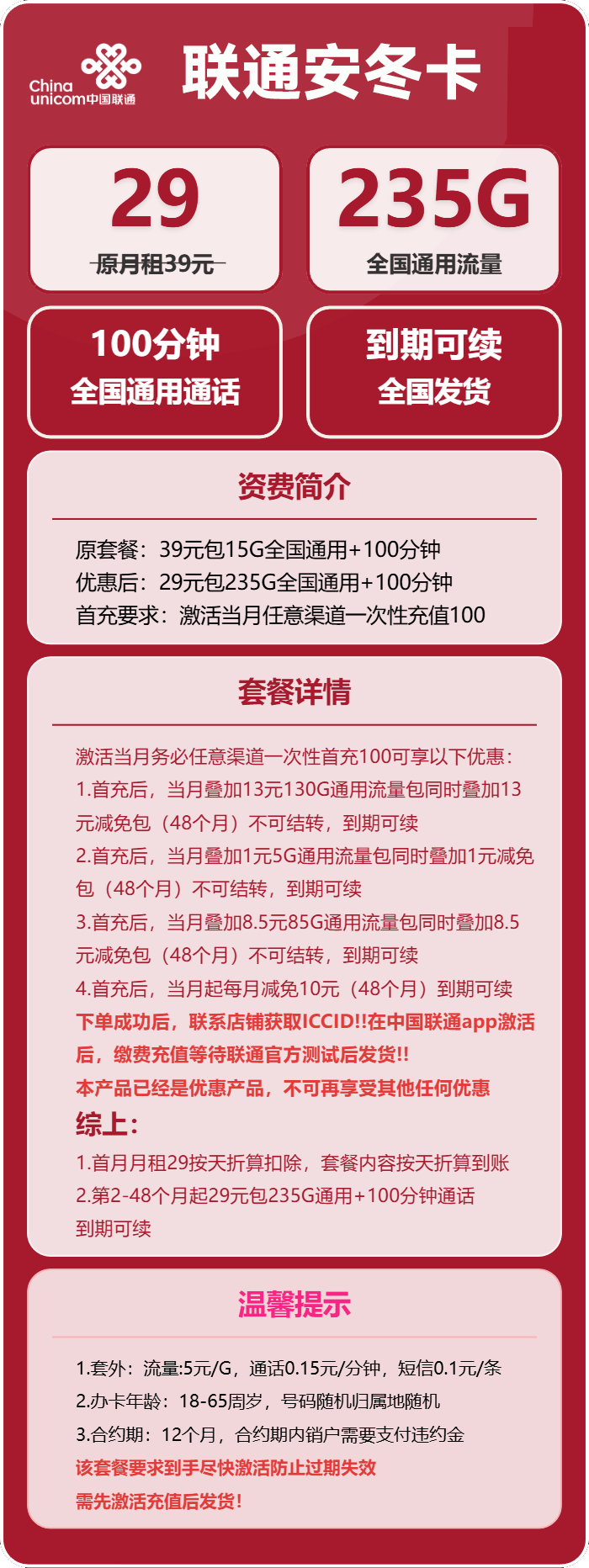 联通安冬卡29元月享235G通用+100分钟【到期可续 长期套餐】【18到65岁办理】