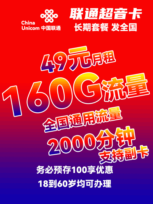 联通超音卡49元月享160G+2000分钟(支持副卡)【长期】【发全国】