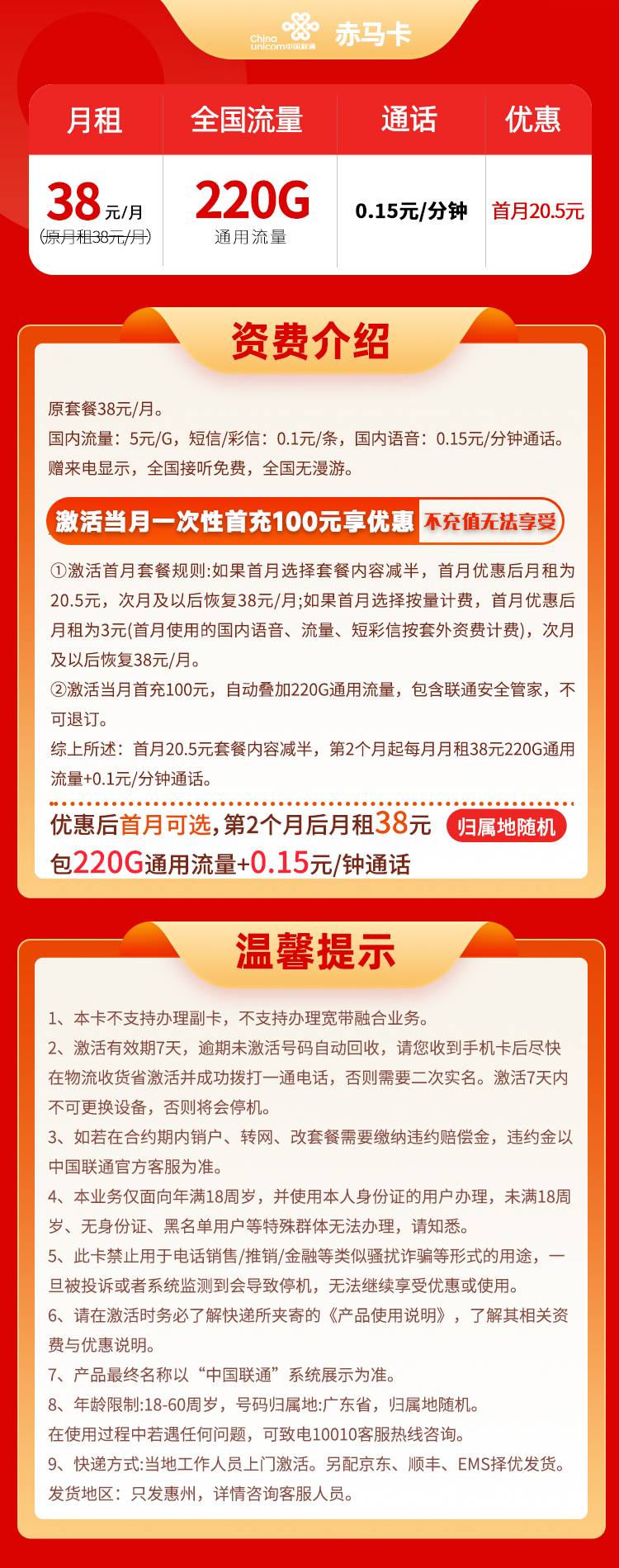 联通赤马卡38元月享220G通用流量+0.15元/分钟通话【只发广东惠州市】