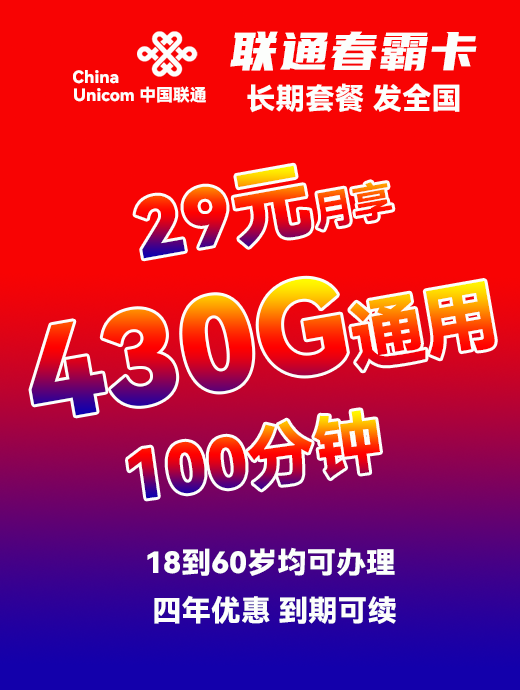 长期联通春霸卡29元月享430G+100分钟【四年优惠 到期可续】【18到60均可办理】