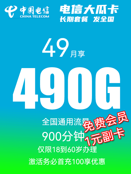 电信大瓜卡49元月享490G+900分钟+1元副卡+一年会员【长期套餐】【18至60岁均可办理】【流量全结转】