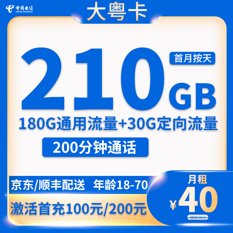 电信大粤卡40元月享210GB流量+200分钟通话【只发广州/深圳/佛山/中山/东莞/惠州】/深圳/佛山/中山/东莞/惠州】