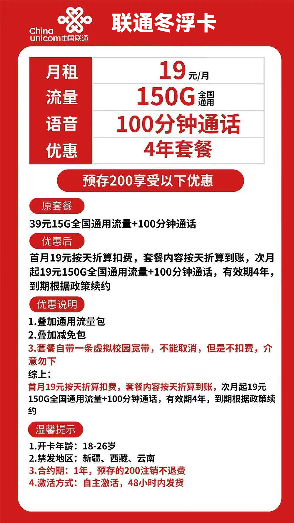 联通冬浮卡19元月享150G通用+100分钟【四年套餐】【发全国】