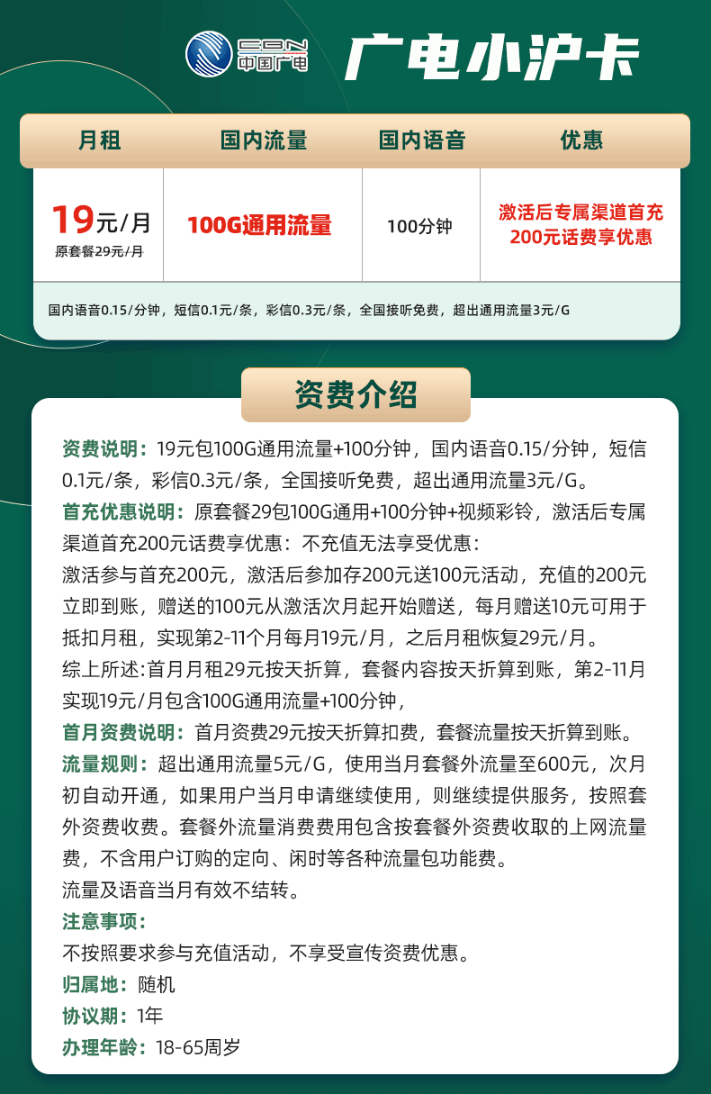 广电小沪卡19元月享100G+100分钟(仅发上海)