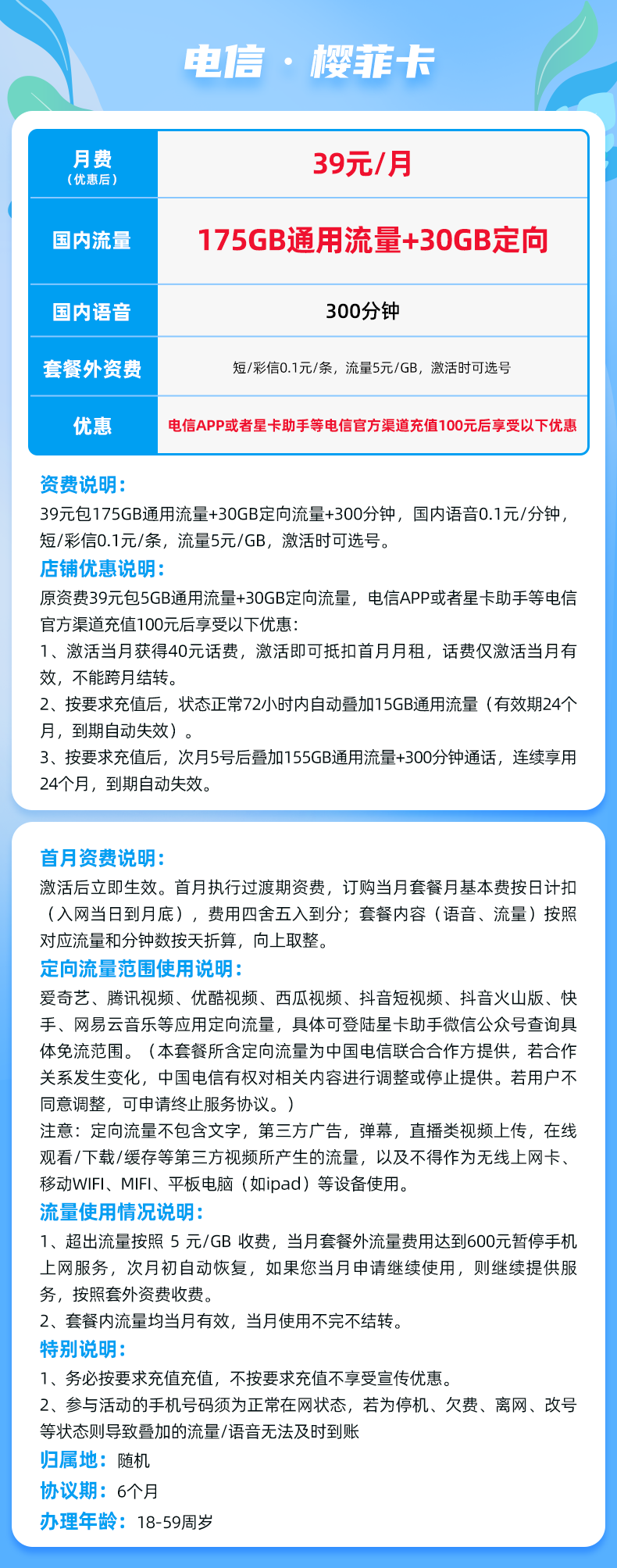 电信樱菲卡39元月享205G+300分钟(仅发广西)