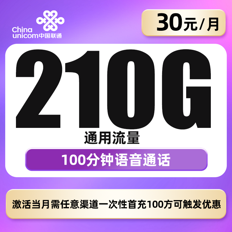 【贵州联通】30元月享210G+100分钟+会员
