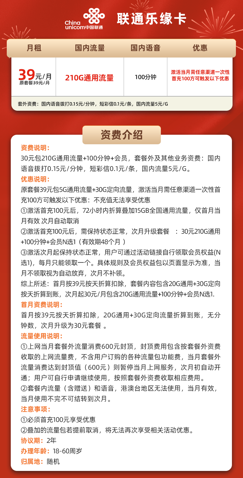 联通乐缘卡30元月享210G+100分钟+会员(只发贵州)