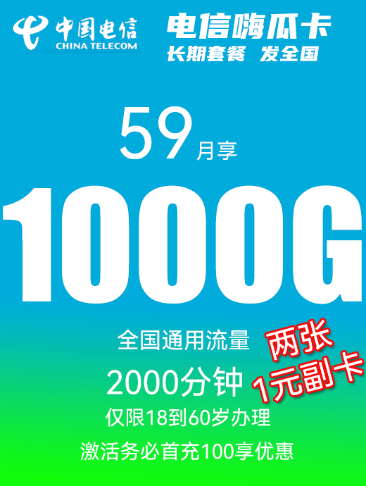 电信嗨瓜卡59元月享1000G+2000分钟+两张1元副卡【长期套餐】【18至60岁均可办理】【流量全结转】