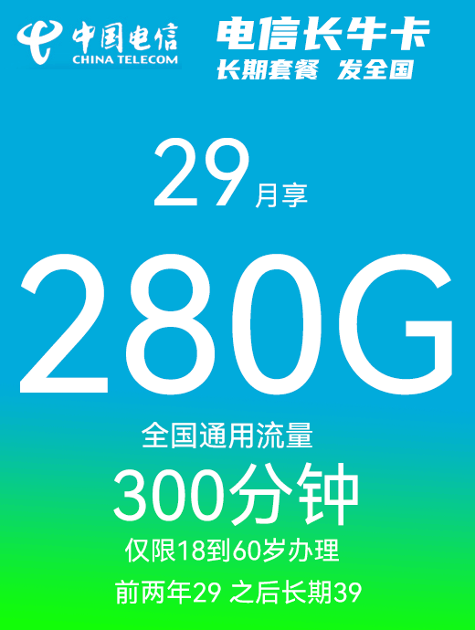 电信长牛卡29元月享280G通用+300分钟!发全国