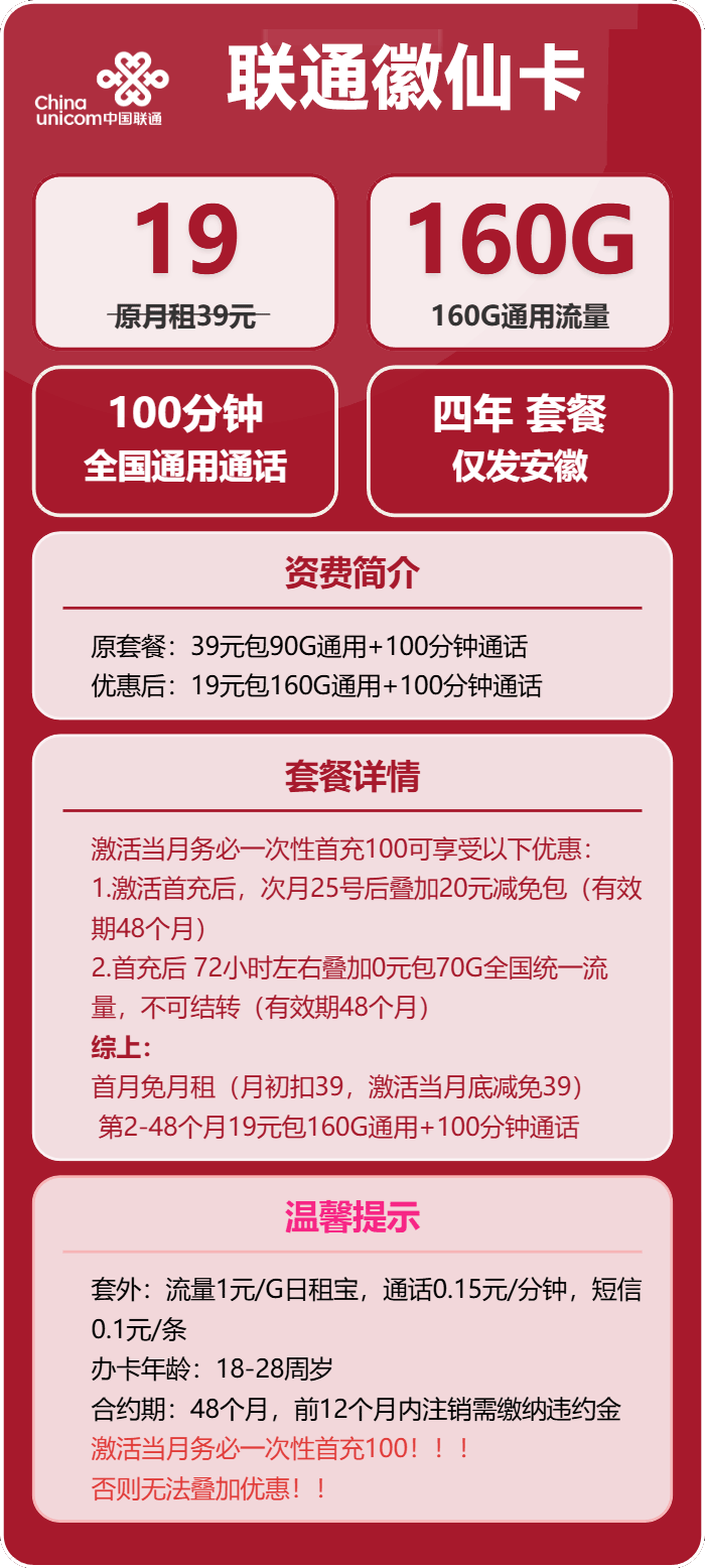 联通徽仙卡19元月享160G通用+100分钟【四年套餐 仅发安徽】