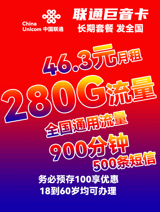 【联通语音】46.3元月享280G+900分钟
