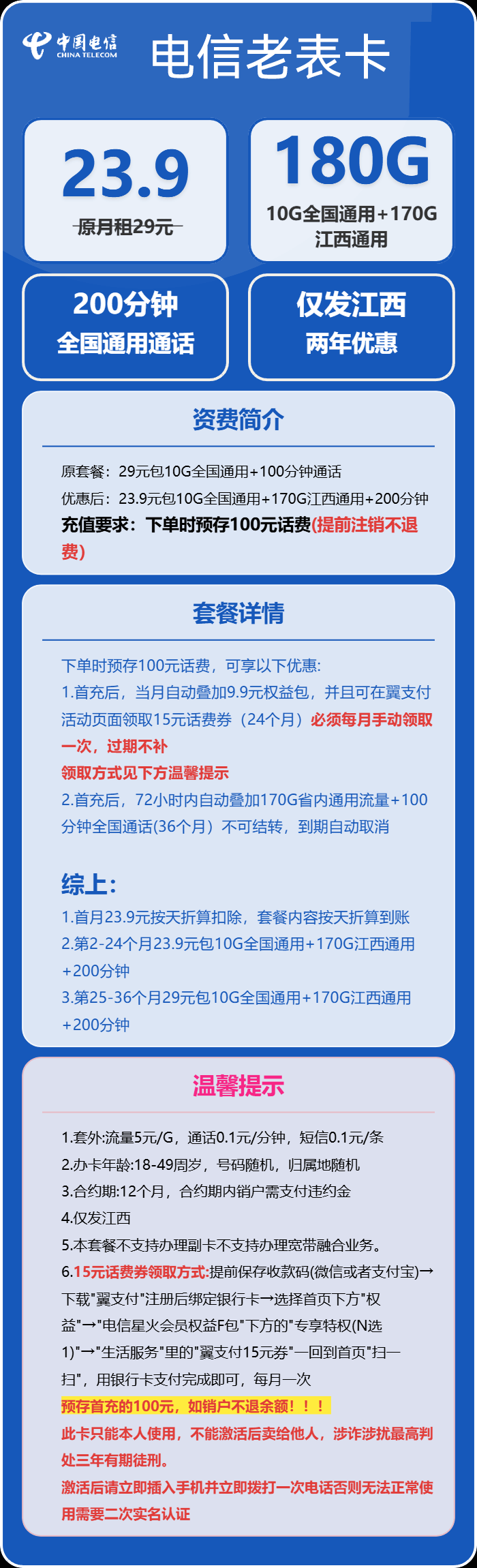 电信老表卡23.9元月享180G+200分钟通话【仅发江西】