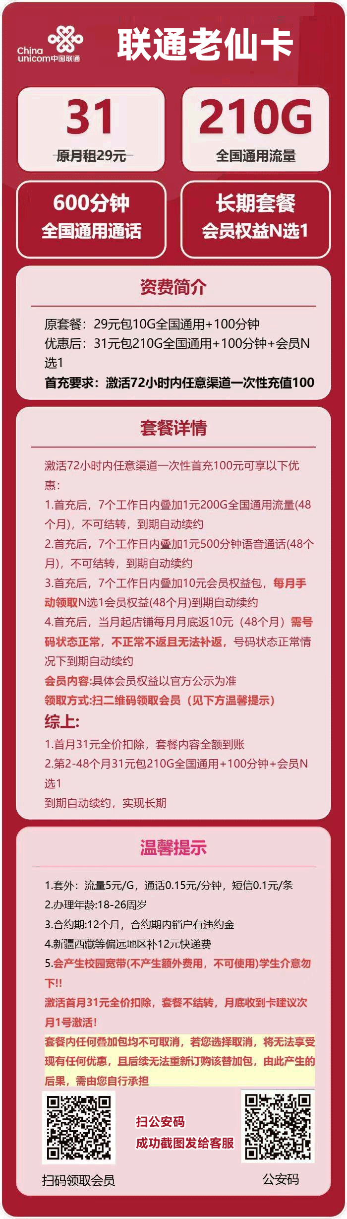 联通老仙卡31元月享210G通用+600分钟+会员N选1【长期套餐 发全国】
