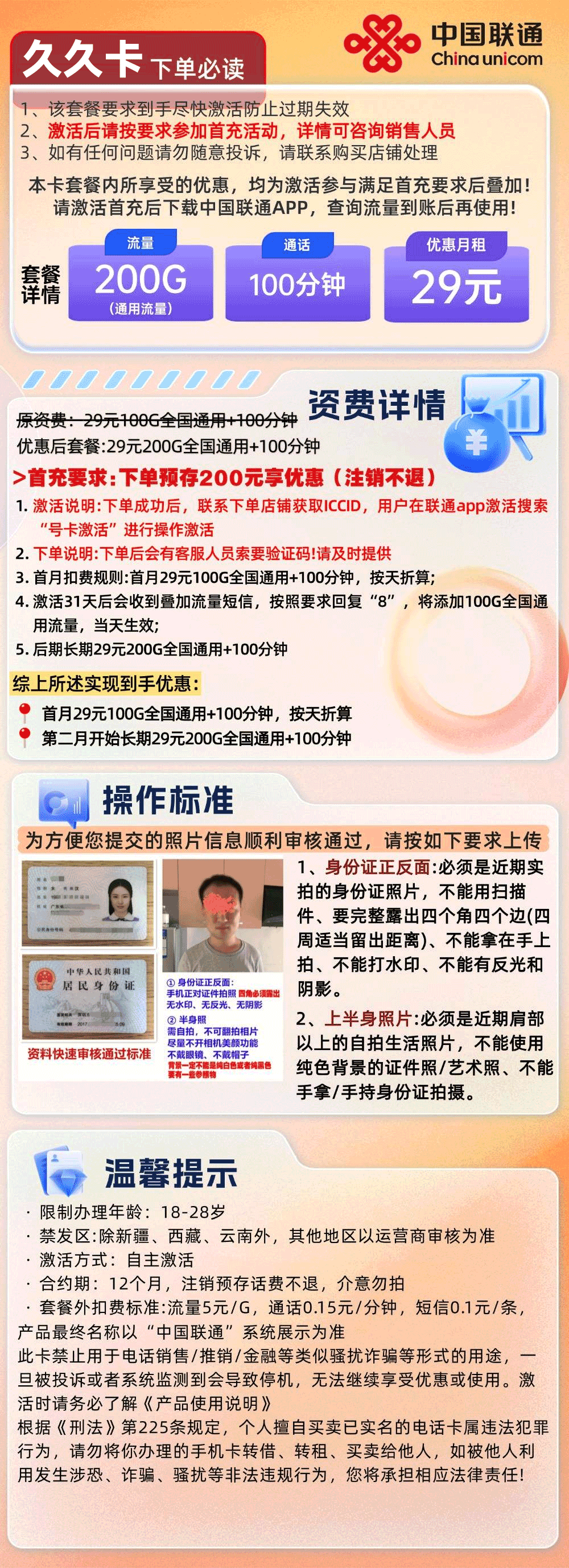 联通久久卡29元月享200G通用+100分钟通话