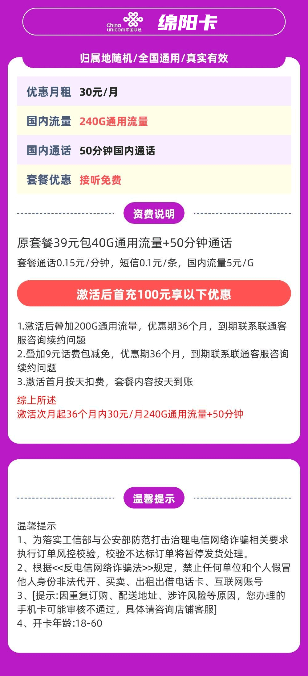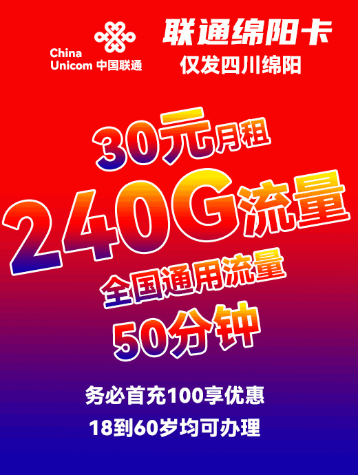 (18-60岁) 三年联通绵阳卡30元月享240G通用+50分钟【仅发四川绵阳】