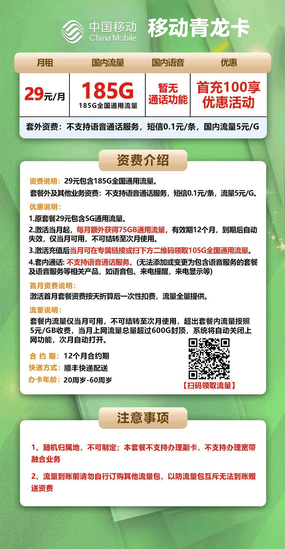 移动青龙卡29元月享185G流量(发全国)【北京新疆西藏也可发】