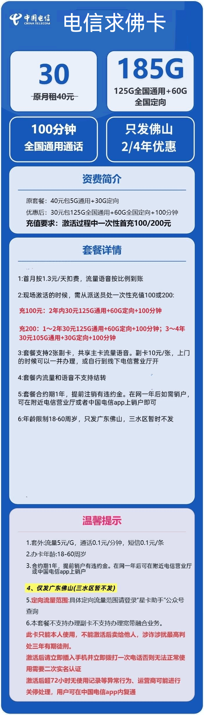 佛山电信求佛卡30元月享185G+100分钟+支持副卡(只发广东佛山)