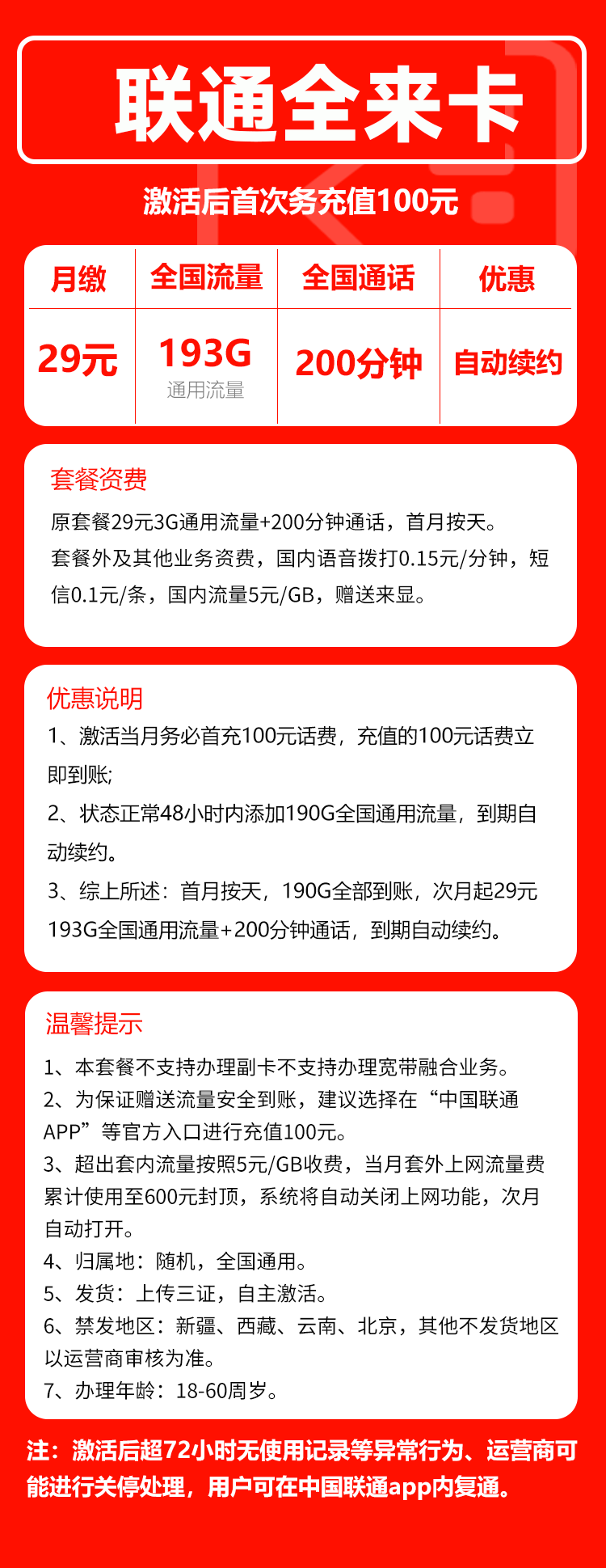 (18-60岁)联通全来卡29元193G通用+200分钟【全国发货/到期自动续】