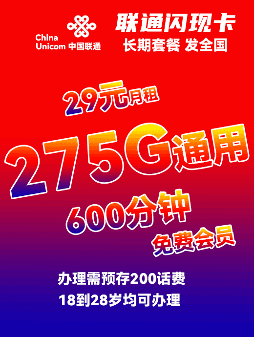 【0元预约 收费办理】联通闪现卡29元月享275G+600分钟+一年会员【发全国】【限今天 下单立即联系客服】