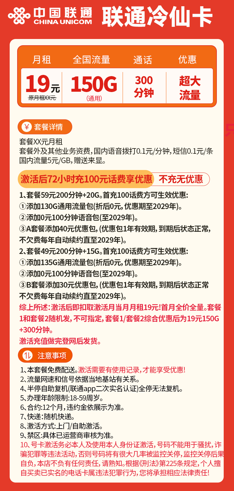 联通冷仙卡19元月享150G+300分钟【长期套餐】【优惠至2029年】