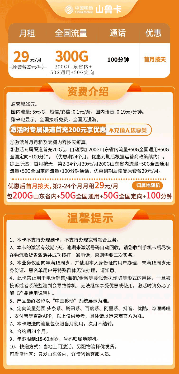 移动山鲁卡29元月享300G流量+100分钟通话【只发山东省内】