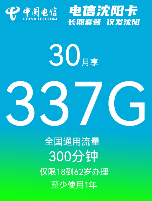 辽宁电信沈阳卡30元月享337G+300分钟【长期套餐】【18到62岁办理】【下单联系客服审核订单】
