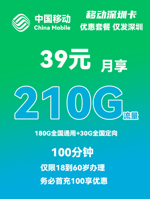 移动深圳卡39元月享210G+100分钟通话【仅发深圳】【180G全国通用+30G全国定向】