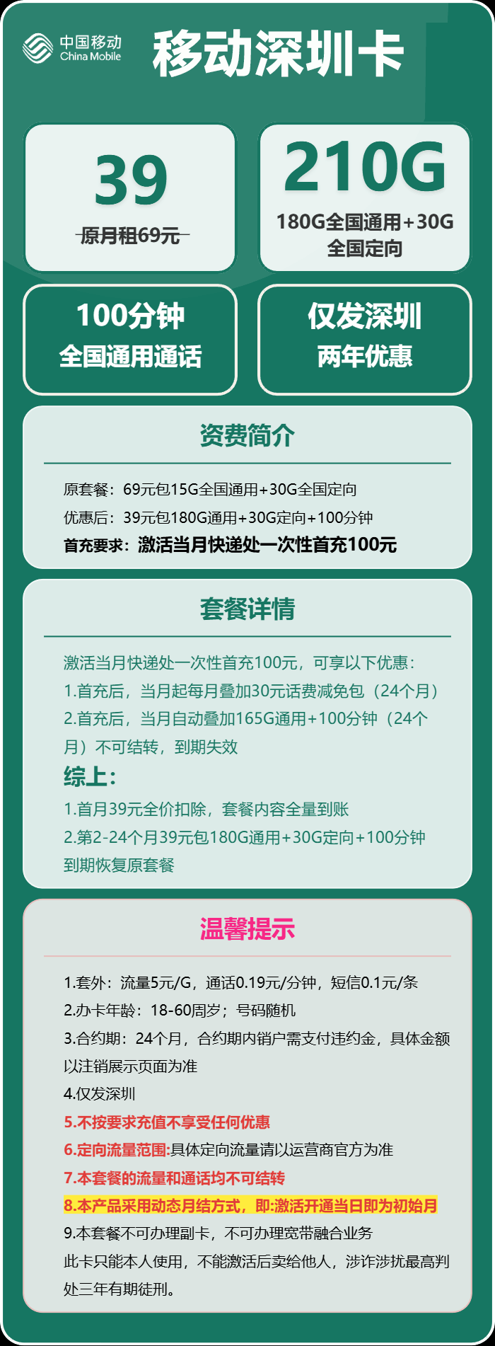 【深圳移动】39元月享210G+100分钟