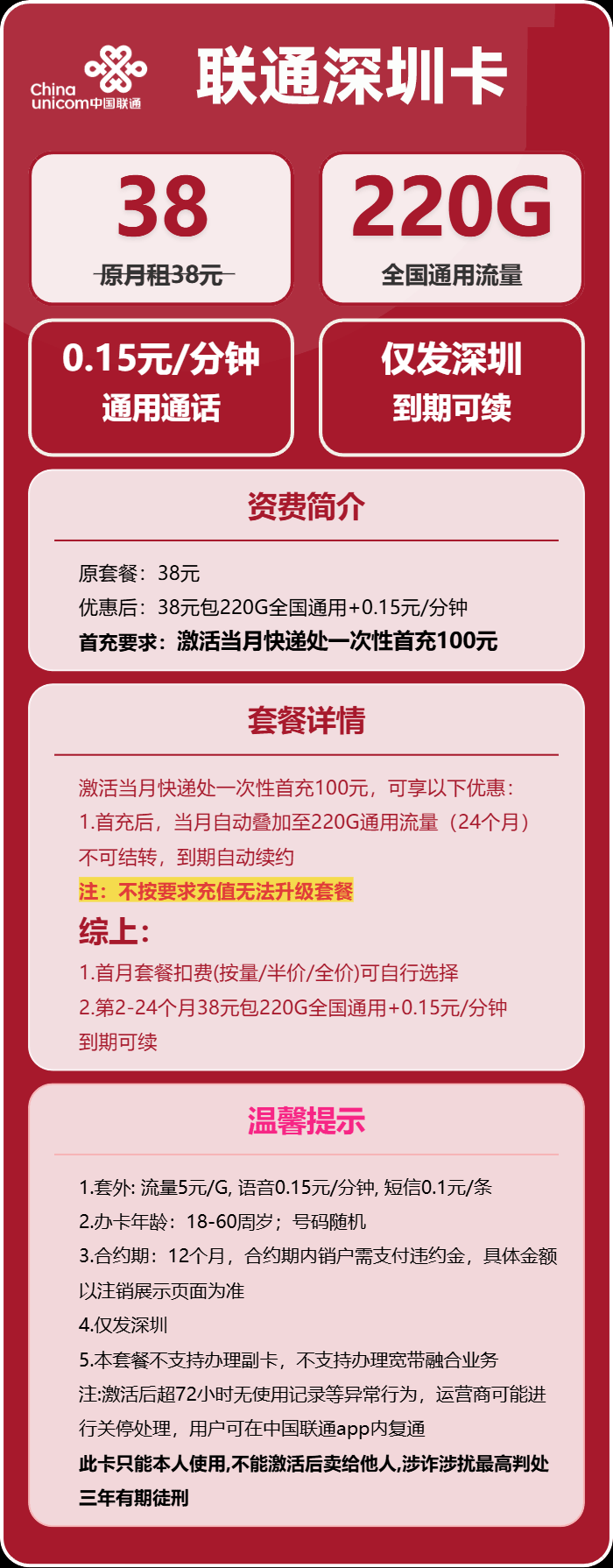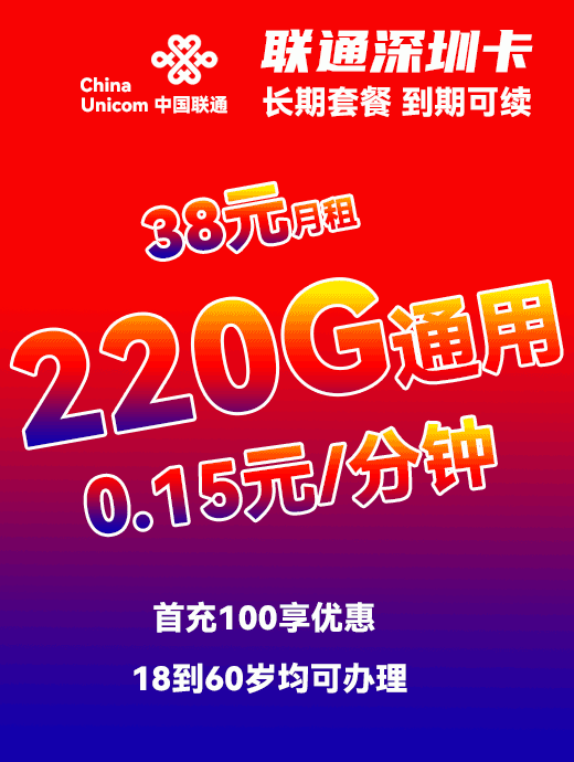 联通深圳卡38元月享220G通用+通话0.15元/分钟【长期套餐 仅发深圳】