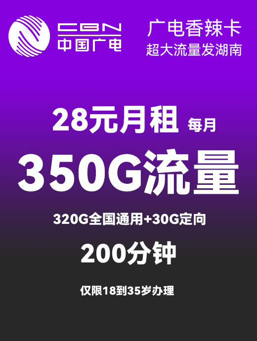 【仅发湖南】广电香辣卡28元月享350G流量【320G通用+30G定向】+200分钟