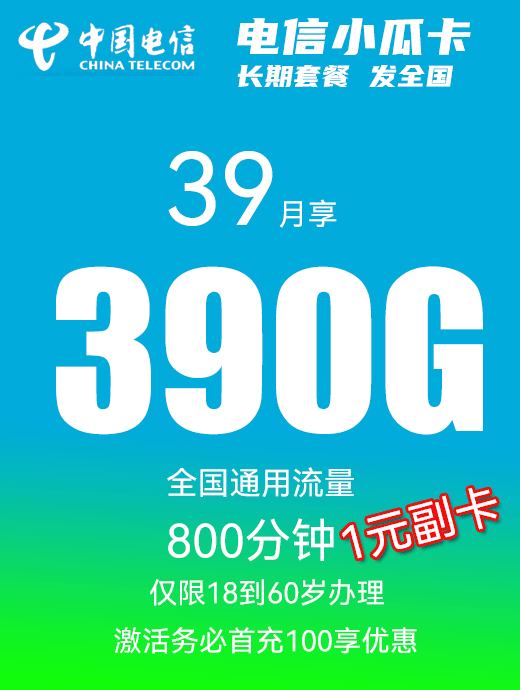 电信小瓜卡39元月享390G+800分钟+1元副卡【长期套餐】【18至60岁均可办理】【流量全结转】