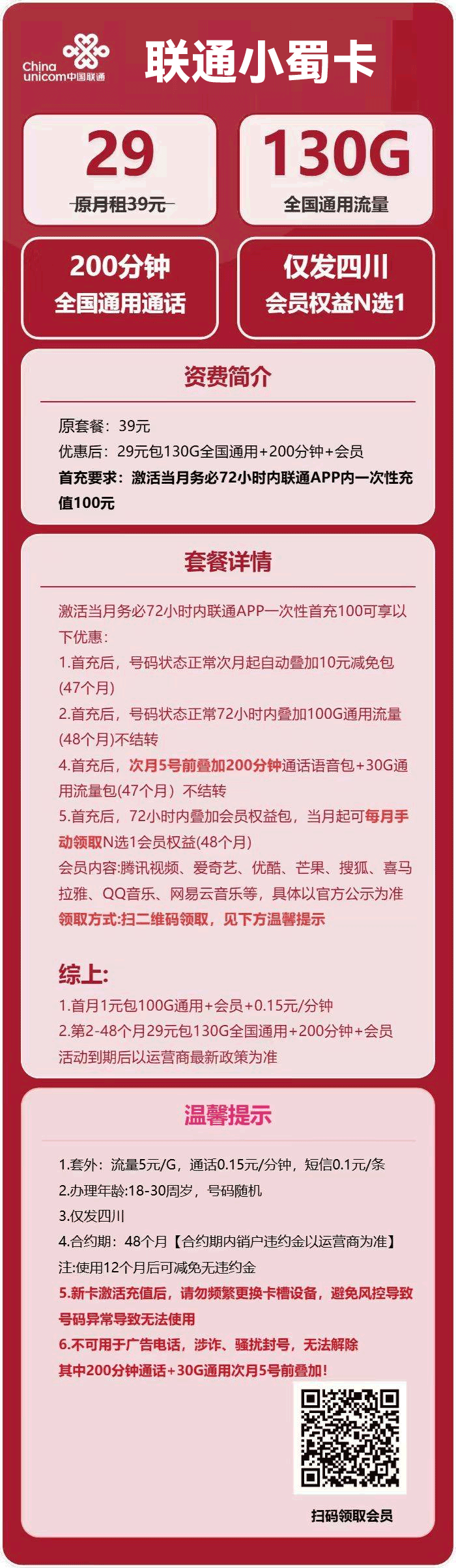 四川联通小蜀卡29元130G通用流量+200分钟+会员【仅发四川】