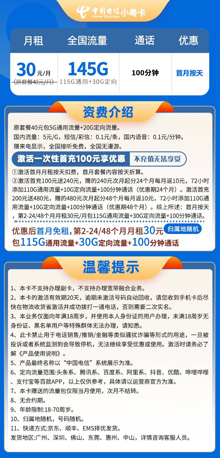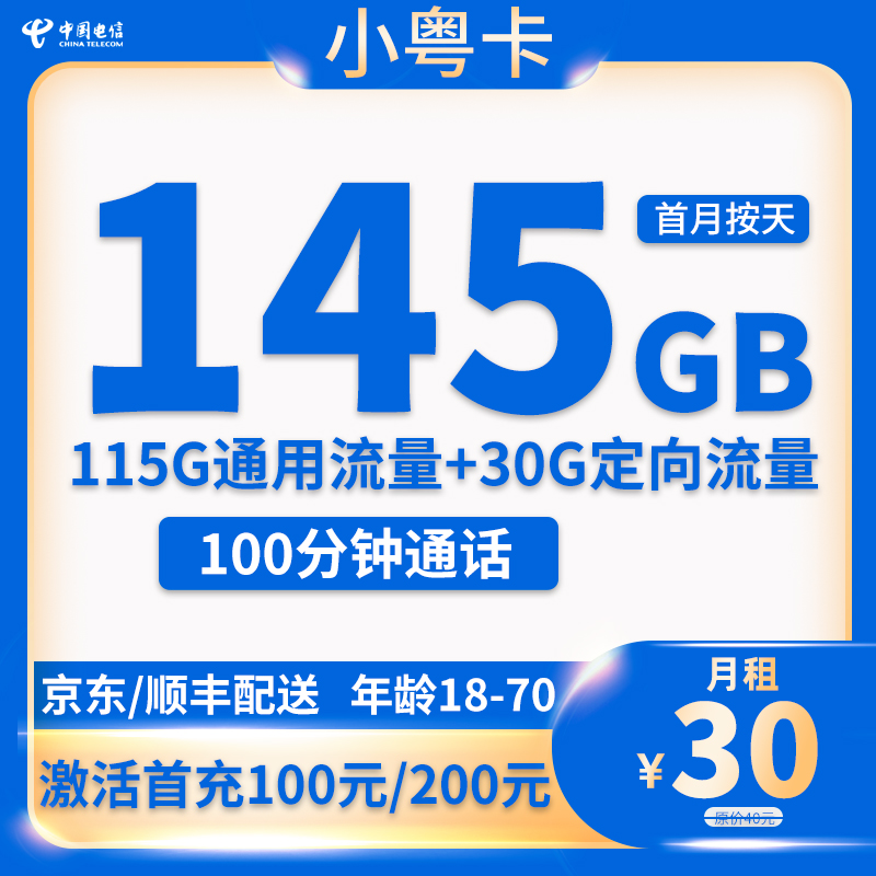电信小粤卡30元月享145GB流量+100分钟通话【只发广州/深圳/佛山/中山/东莞/惠州】