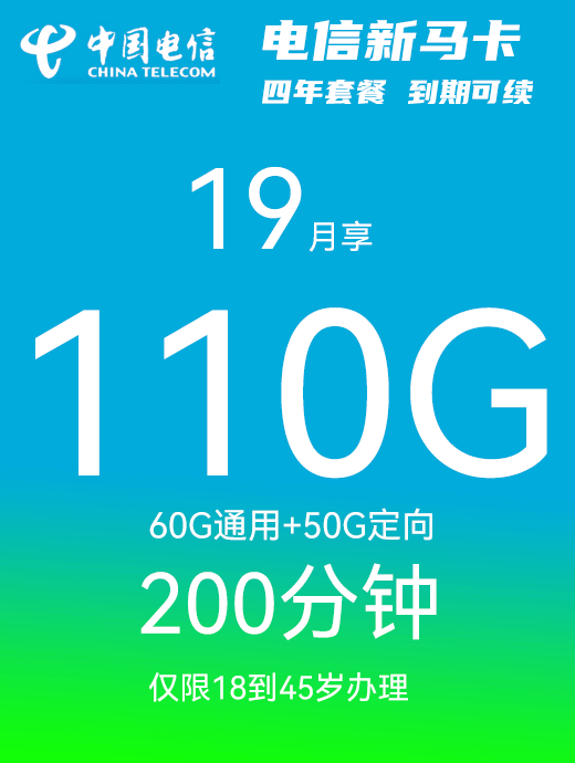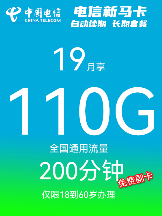 (18-60岁)电信新马卡19元月享110G➕200分钟(前两年需手动回血20消费券)+1张长期0元副卡
