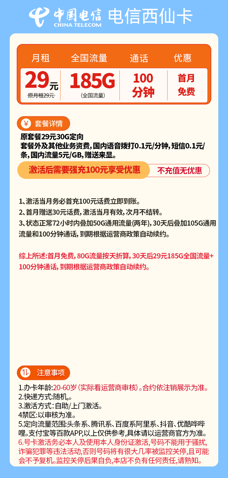 电信西仙卡29元月享185G+100分钟【超值套餐】