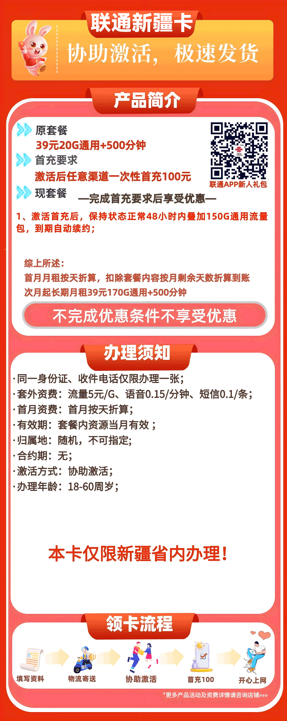 新疆联通39元月享170G通用+500分钟【仅发新疆】