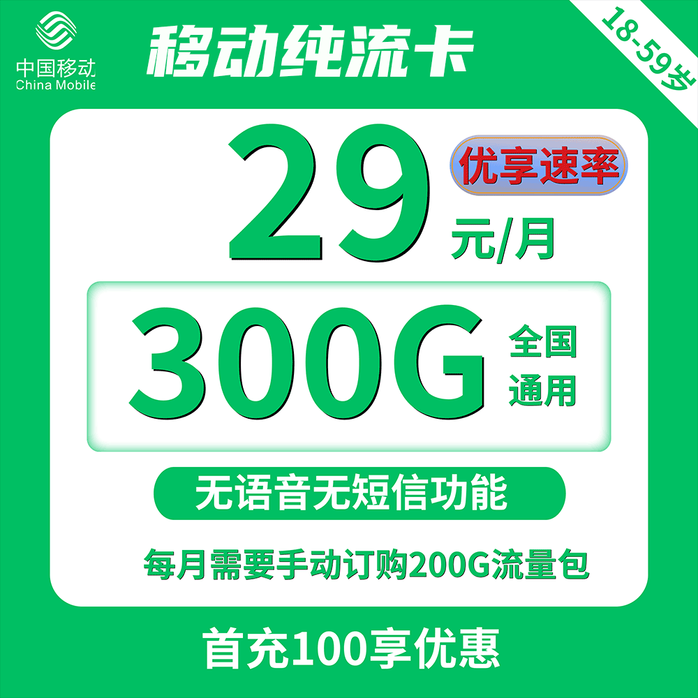 (18-59岁)全国发无禁区长期移动纯流卡29元包300G全国通用➕无语音短信功能